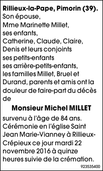 Décédé à Rillieux-la-Pape (69140, France) le dimanche 20 novembre 2016 à l'âge de 84 ans