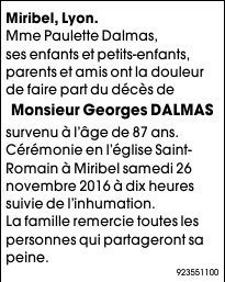 Décédé à Saint-Maurice-de-Beynost (01700, France) le dimanche 20 novembre 2016 à l'âge de 87 ans