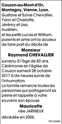 Décédé à Pierre Benite (69310, France) le mardi 24 octobre 2017 à l'âge de 83 ans
