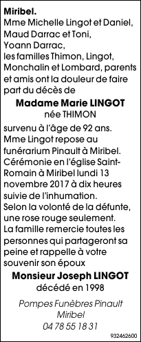 Décédée à Lyon (69003, France) le mercredi 8 novembre 2017 à l'âge de 92 ans
