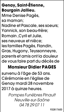 Décédé à Le Bessat (42660, France) le mardi 21 novembre 2017 à l'âge de 53 ans