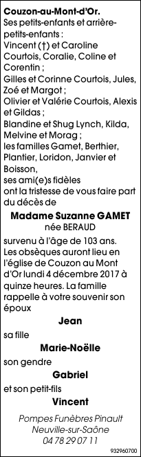 Décédée à Couzon-au-Mont-d'Or (69270, France) le lundi 27 novembre 2017 à l'âge de 103 ans