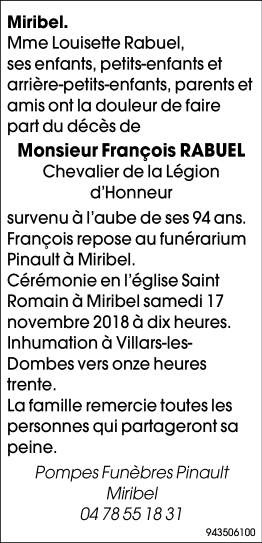 Décédé à Miribel (01700, France) le mercredi 14 novembre 2018 à l'âge de 93 ans