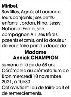 Décédée à Belleville-en-Beaujolais (69220, France) le dimanche 31 octobre 2021 à l'âge de 68 ans