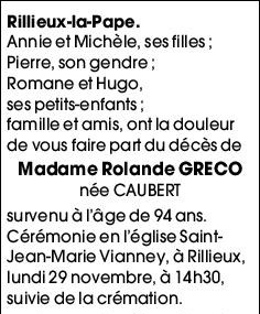 Décédée à Rillieux-la-Pape (69140, France) le vendredi 19 novembre 2021 à l'âge de 94 ans