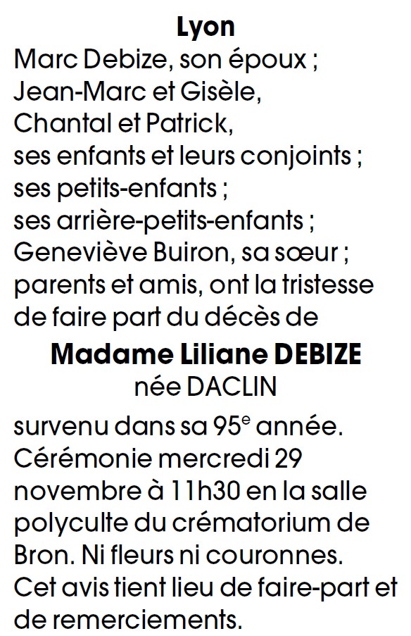 Décédée à Lyon (69003, France) le dimanche 19 novembre 2023 à l'âge de 94 ans