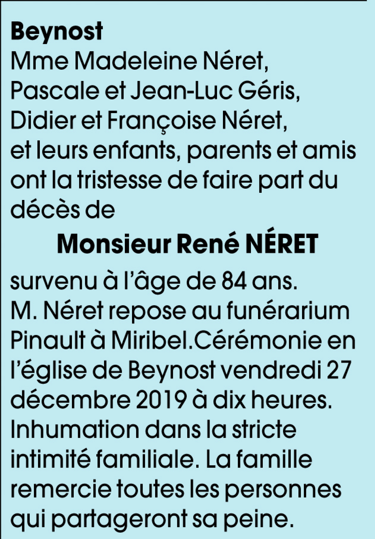 Décédé à Beynost (01700, France) le samedi 21 décembre 2019 à l'âge de 84 ans