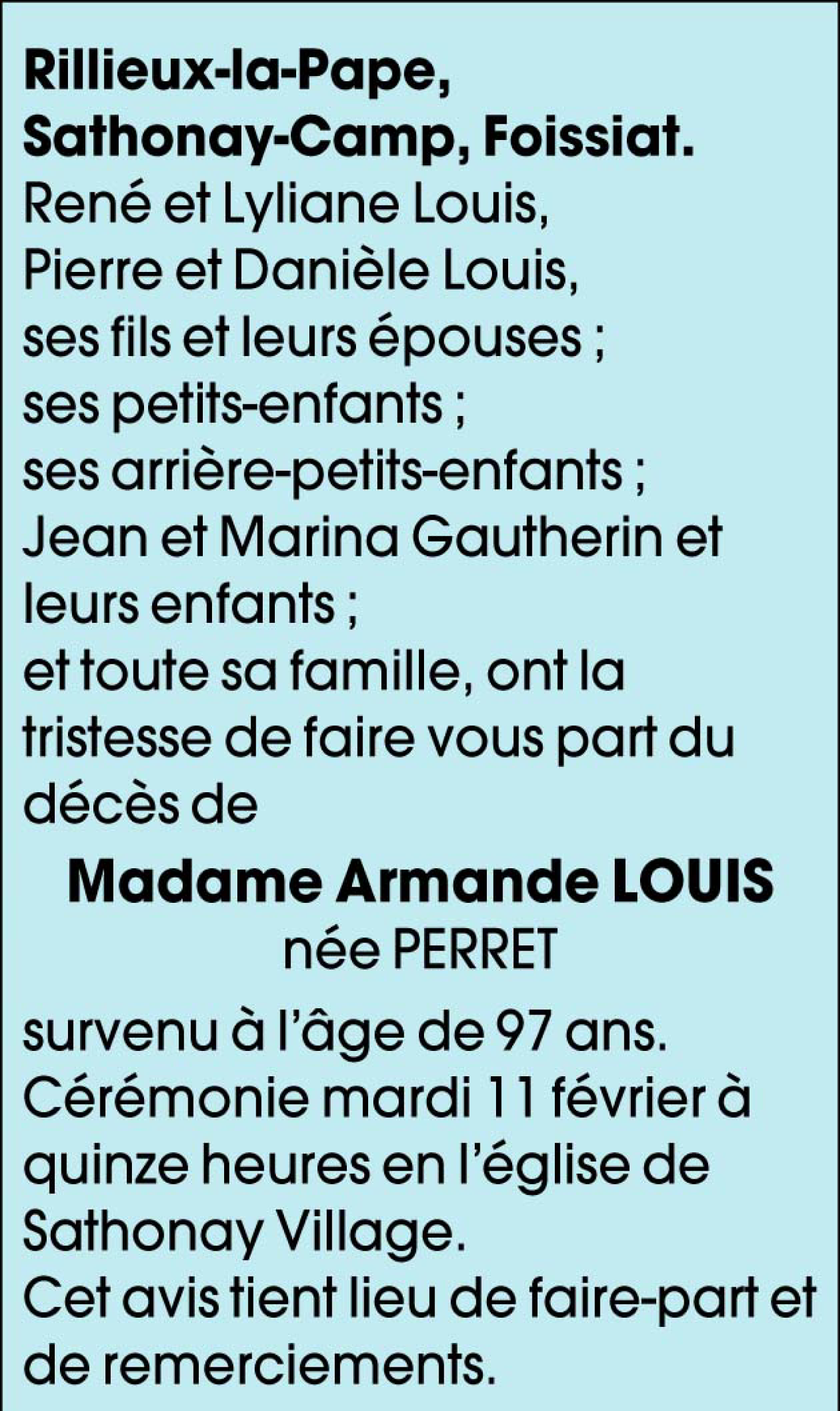 Décédée à Sathonay-Camp (69580, France) le mercredi 5 février 2020 à l'âge de 97 ans