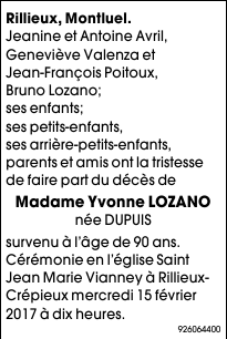 Décédée à Rillieux-la-Pape (69140, France) le jeudi 9 février 2017 à l'âge de 90 ans