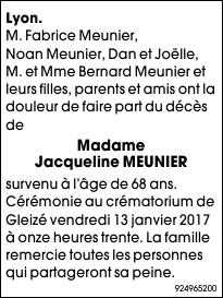 Décédée à Trévoux (01600, France) le samedi 7 janvier 2017 à l'âge de 68 ans