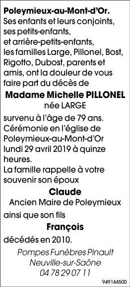 Décédée à Albigny-sur-Saône (69250, France) le mercredi 24 avril 2019 à l'âge de 79 ans