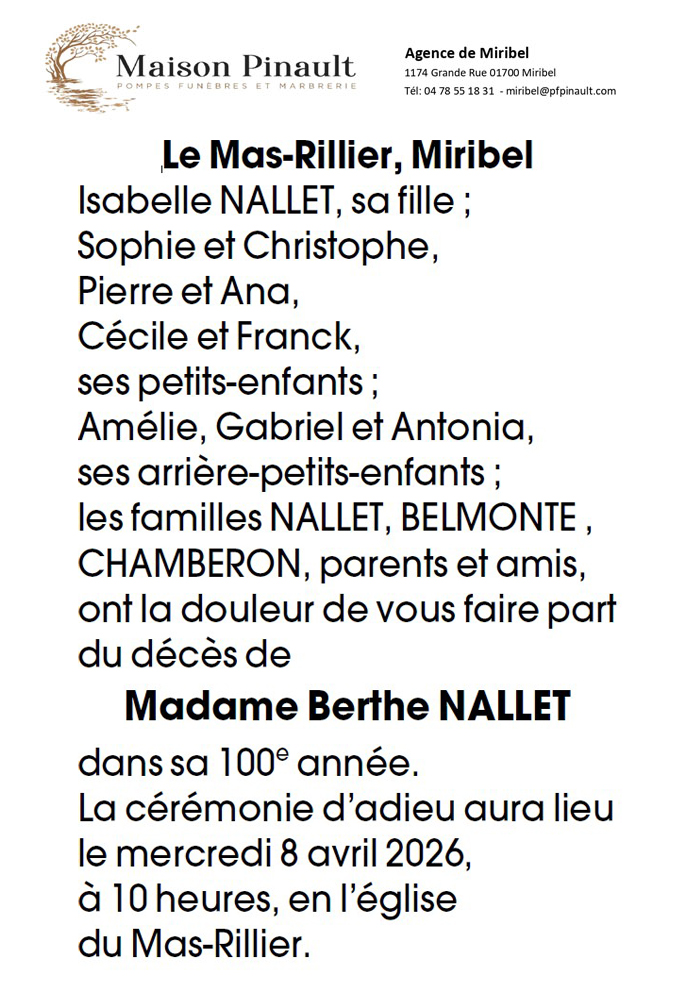 Décédée à Miribel (01700, France) le jeudi 2 avril 2026 à l'âge de 99 ans