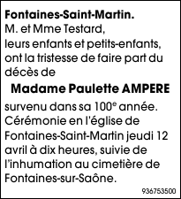 Décédée à Fontaines-Saint-Martin (69270, France) le samedi 7 avril 2018 à l'âge de 99 ans