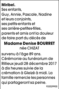 Décédée à Sathonay-Village (69580, France) le mardi 19 décembre 2017 à l'âge de 89 ans