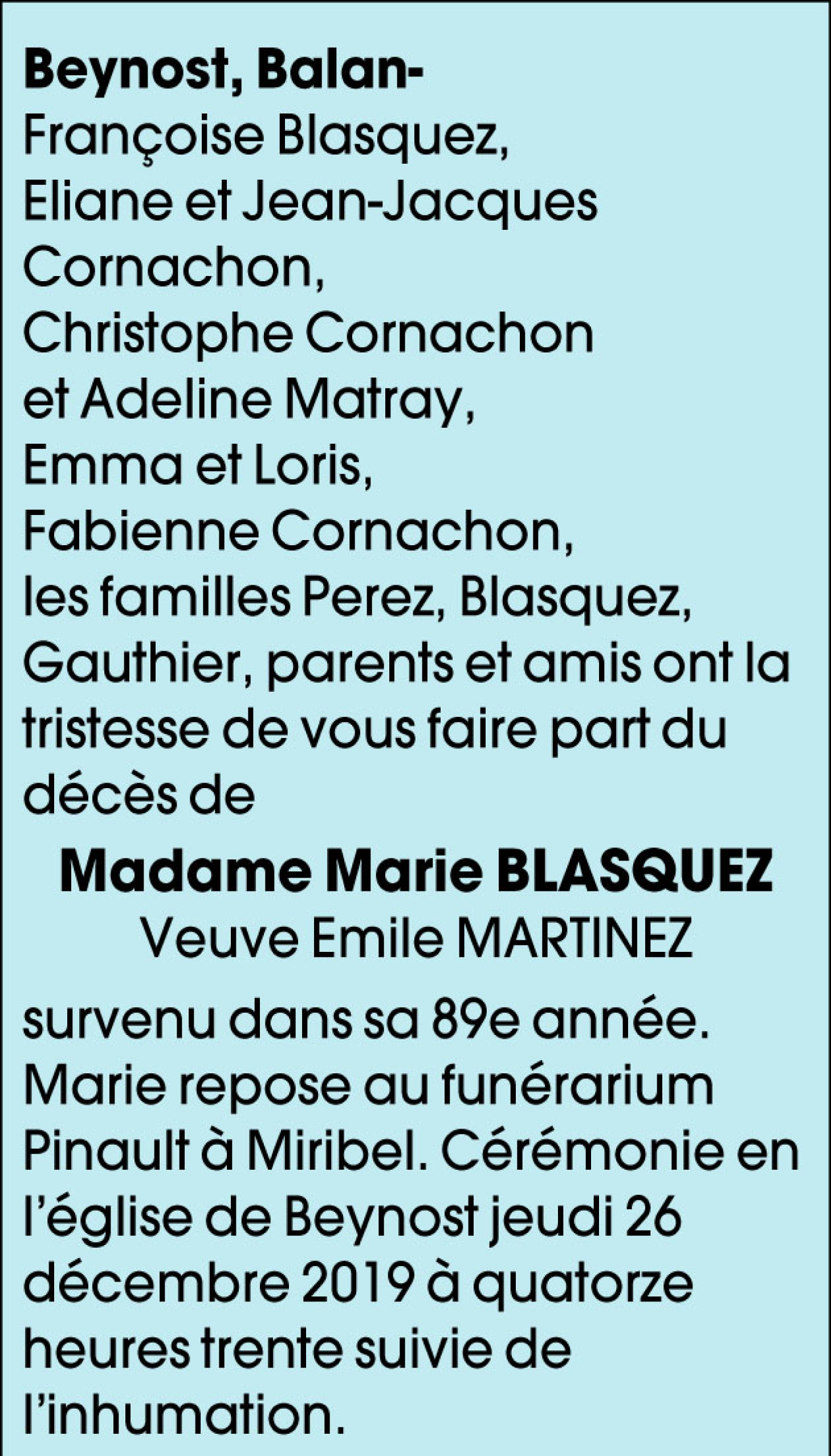 Décédée à Beynost (01700, France) le dimanche 22 décembre 2019 à l'âge de 88 ans