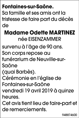 Décédée à Sathonay-Camp (69580, France) le lundi 15 avril 2019 à l'âge de 90 ans