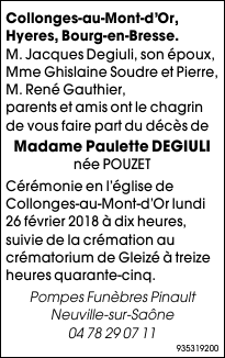 Décédée à Collonges-au-Mont-d'Or (69660, France) le jeudi 22 février 2018 à l'âge de 88 ans