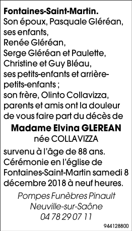 Décédée à Neuville-sur-Saône (69250, France) le mardi 4 décembre 2018 à l'âge de 88 ans