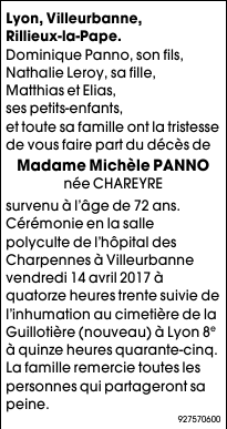 Décédée à Villeurbanne (69100, France) le lundi 10 avril 2017 à l'âge de 72 ans
