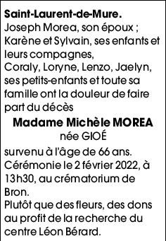 Décédée à Lyon (69008, France) le jeudi 20 janvier 2022 à l'âge de 66 ans