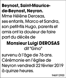 Décédé à Saint-Didier-au-Mont-d'Or (69370, France) le lundi 18 février 2019 à l'âge de 76 ans