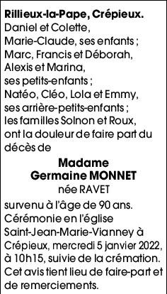 Décédée à Rillieux-la-Pape (69140, France) le mardi 28 décembre 2021 à l'âge de 90 ans