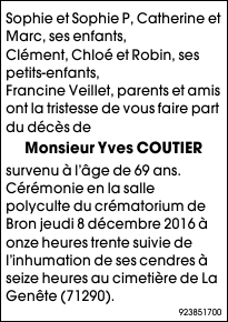 Décédé à Trévoux (01600, France) le jeudi 1 décembre 2016 à l'âge de 69 ans