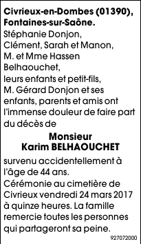 Décédé à Reyrieux (01600, France) le vendredi 17 mars 2017 à l'âge de 44 ans