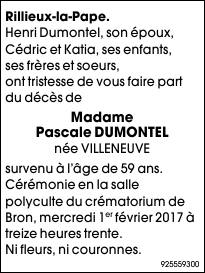 Décédée à Meximieux (01800, France) le mardi 24 janvier 2017 à l'âge de 59 ans