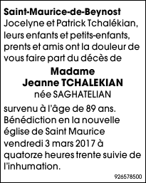 Décédée à Saint-André-de-Corcy (01390, France) le mardi 28 février 2017 à l'âge de 89 ans