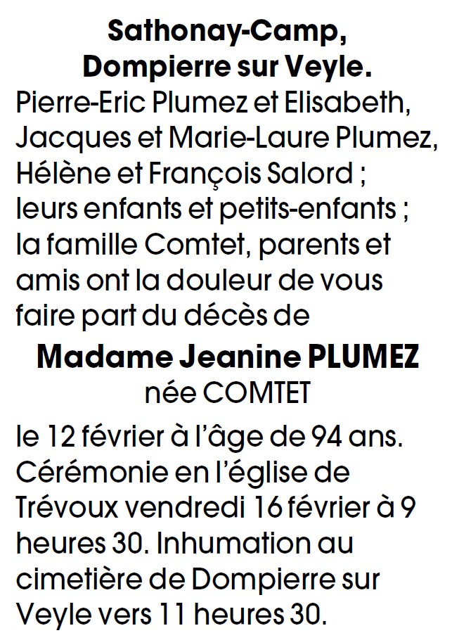 Décédée à Trévoux (01600, France) le lundi 12 février 2024 à l'âge de 94 ans