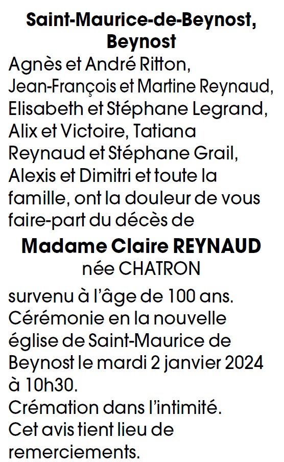 Décédée à Montluel (01120, France) le vendredi 22 décembre 2023 à l'âge de 100 ans
