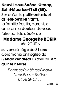 Décédée à Neuville-sur-Saône (69250, France) le mercredi 11 avril 2018 à l'âge de 81 ans