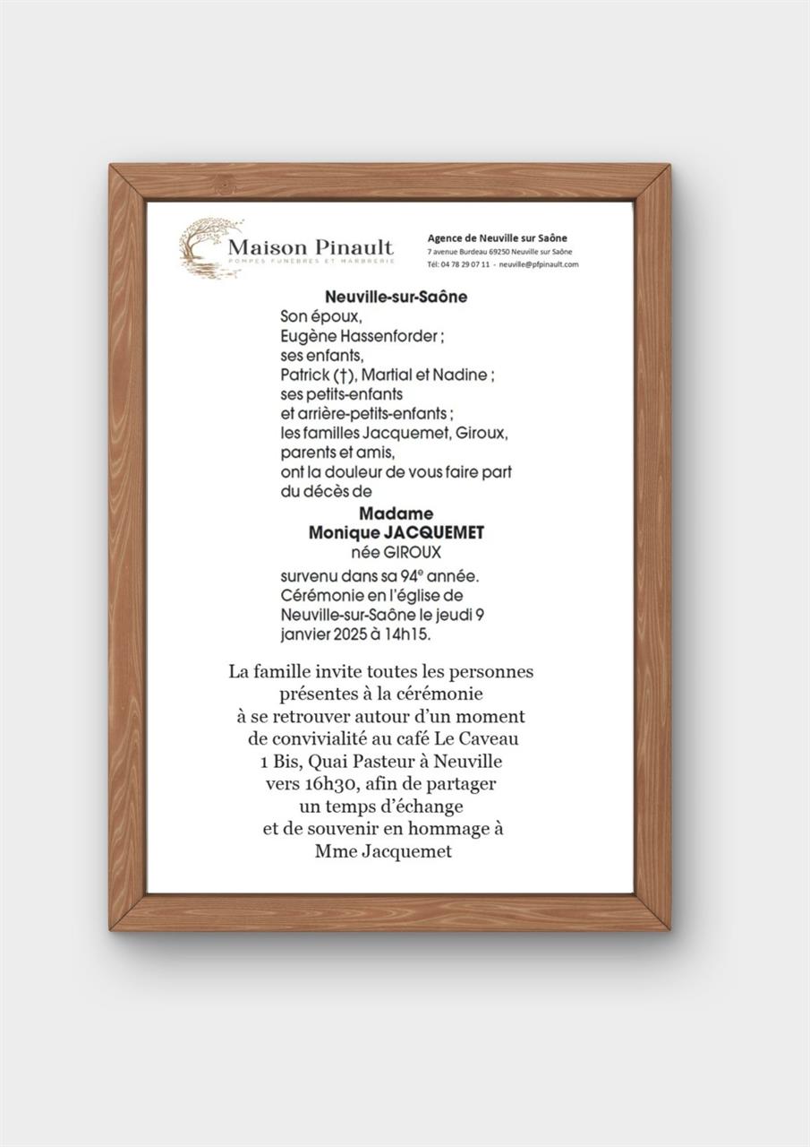 Décédée à Neuville-sur-Saône (69250, France) le lundi 6 janvier 2025 à l'âge de 93 ans