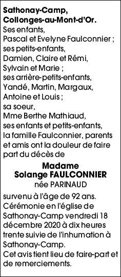 Décédée à Anse (69480, France) le lundi 14 décembre 2020 à l'âge de 92 ans