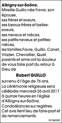 Décédé à Albigny-sur-Saône (69250, France) le jeudi 20 avril 2017 à l'âge de 76 ans