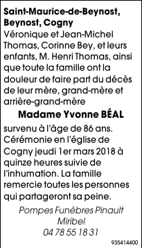 Décédée à Saint-Maurice-de-Beynost (01700, France) le lundi 26 février 2018 à l'âge de 86 ans