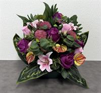 | Composition de fleurs tergal Composition de fleurs tergal dans un pot lesté avec des roses et anthuriums.