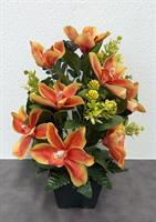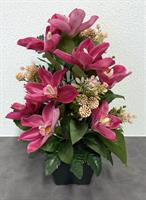| Composition de fleurs tergal Composition de fleurs tergal dans un pot lesté avec des roses et orchidées.